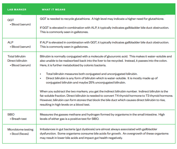 Common lab tests and markers include: • GGT (serum) - high • ALP (serum) - high • Bilirubin (serum) - high • SIBO (breath) - positive • Microbiome (stool) - positive for gut dysbiosis