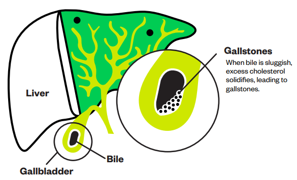 What Causes Gallstones to Form? For bile to stay fluid and prevent gallstone formation, there must be a proper balance between cholesterol and phosphatidylcholine, ideally at a 1:10 ratio. Typical bile solids consist of around 80% bile salts.16 Cholesterol is converted into bile salts in the liver. When the proportion of bile salts and/or phospholipids decreases and cholesterol levels remain too high, the bile thickens, making it sluggish. This happens because excess cholesterol solidifies, leading to gallstones.4 These gallstones block the bile ducts, stopping bile from reaching the small intestine. Over 70-85% of gallstones are predominantly cholesterol.11 Gallstones are significantly more common in women than in men. This is because estrogen increases cholesterol production while reducing bile acid synthesis.11 The PEMT enzyme is responsible for synthesizing phosphatidylcholine necessary to transport cholesterol out of the liver. Once removed from the liver, cholesterol is packaged into bile, thereby maintaining healthy cholesterol levels. When PEMT slows down or is impaired, cholesterol accumulates in the liver, leading to various health issues, including an increased risk of gallstone formation.11 Pregnant women are particularly vulnerable to gallstone formation due to several physiological changes.12 One major factor is choline deficiency. Over 90% of pregnant women are deficient in choline, a nutrient crucial for maintaining PEMT enzyme function and phosphatidylcholine production.13 A dirty PEMT, and low choline, contribute to higher cholesterol in the liver, and more sluggish bile, thus, the increased risk for gallstones.
