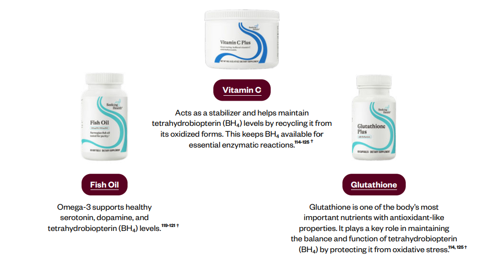 Tetrahydrobiopterin (BH4) is required to produce serotonin, dopamine, and norepinephrine. These neurotransmitters are vital for mood stability, motivation, pleasure, and emotional resistance.