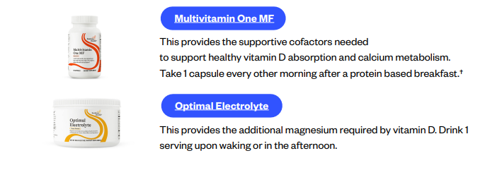 Vitamin D activation and calcium metabolism requires additional nutrients such as vitamin K2, zinc, boron, magnesium, vitamin B2, and vitamin B6.16, 17, 18, 19† Many of these nutrients are found in a multivitamin and electrolytes.