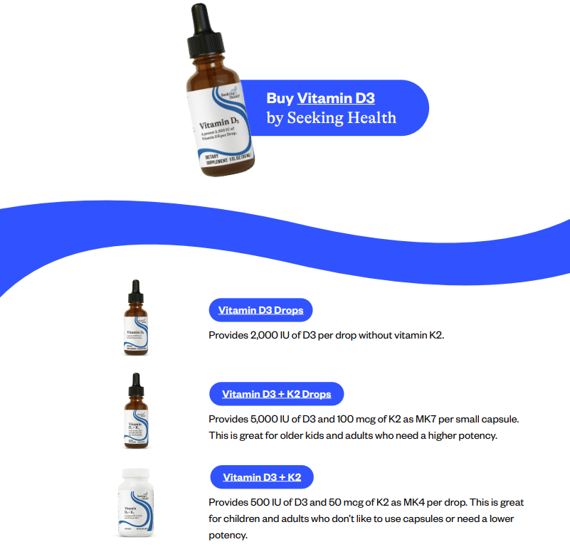 • Vitamin D3 + K2 Drops provides 500 IU of D3 per drop. This may be used by kids 1 year old and up.